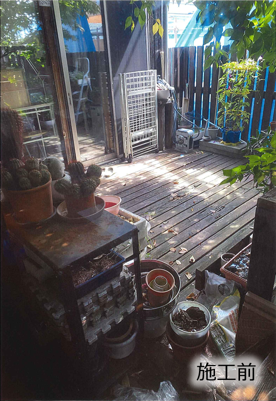 雨風や植木鉢などで経年劣化が進み木が傷んだ状態でした。(約18年間)