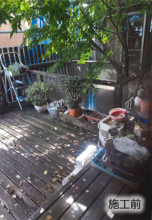元々のウッドデッキは、コの字型で屋上への階段などがあり、周遊できない状態でした。