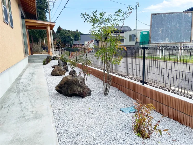 新築外構事例|700㎡の広い庭!コストを抑えた雑草対策、建物と調和する植栽・庭石で魅せる外構に